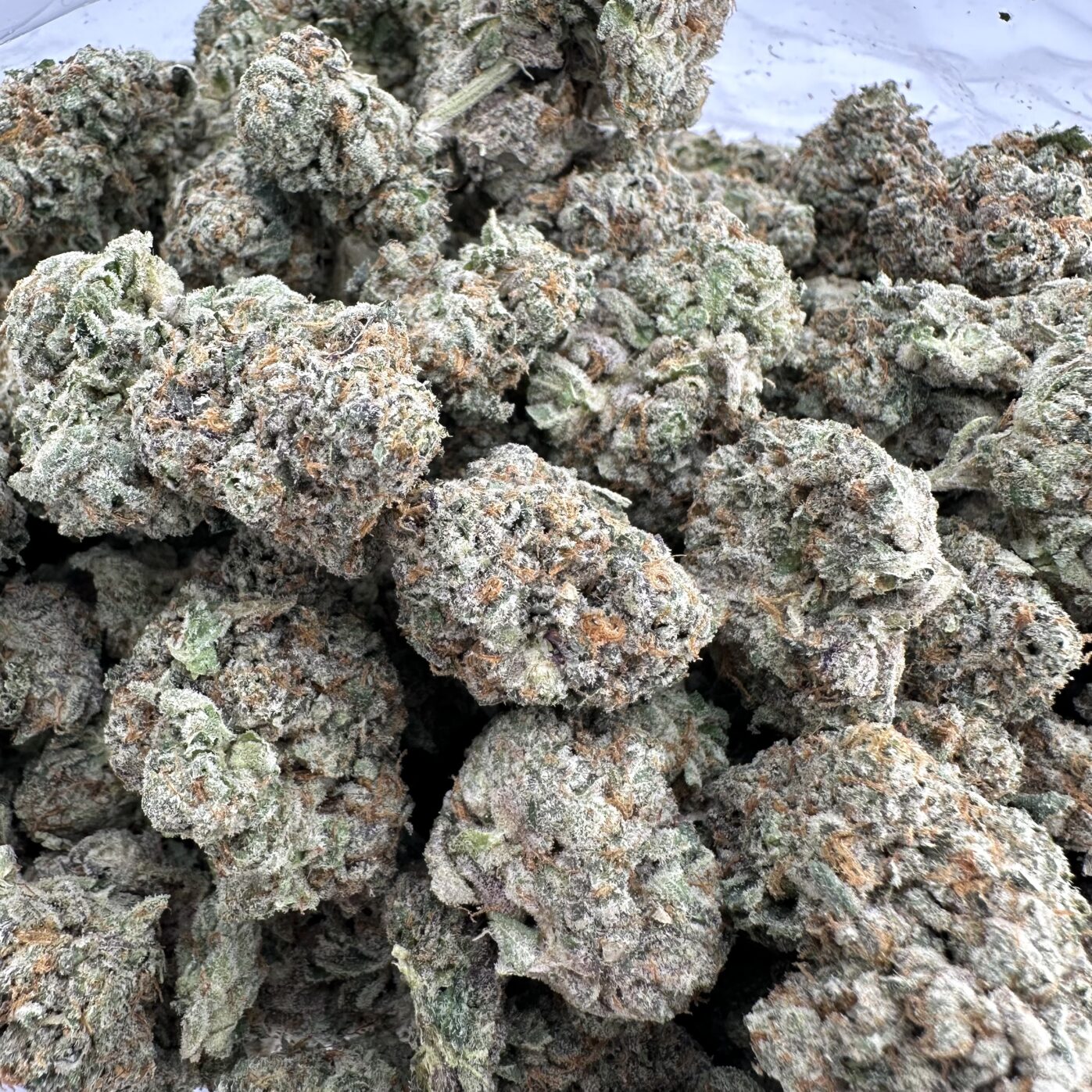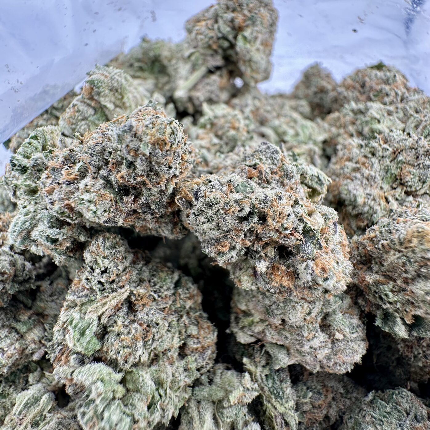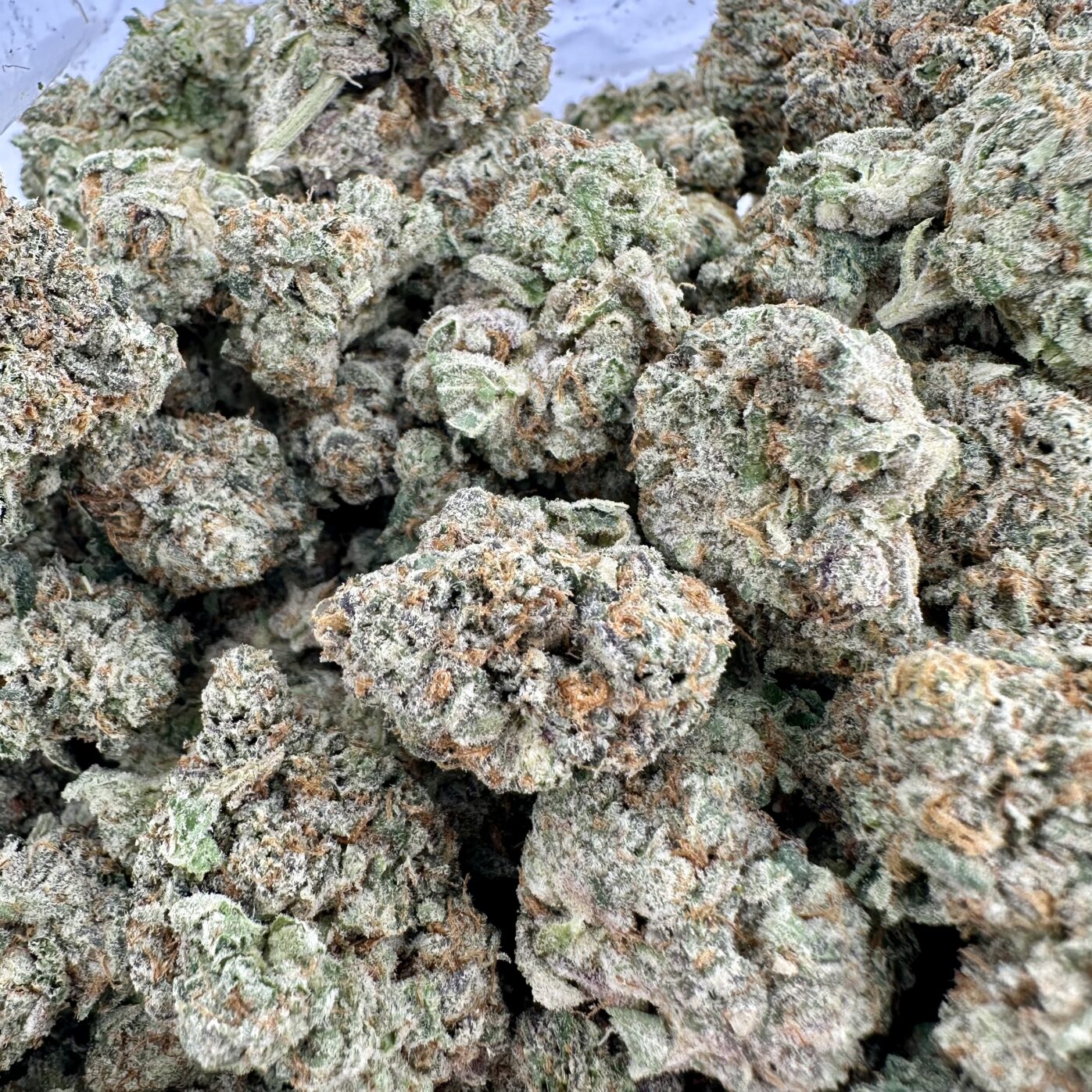 Georgia Pie is a slightly indica dominant hybrid strain (60% indica/40% sativa) created through crossing the infamous Gellati X Kush Mints strains. Although it’s hard to find outside of the Colorado area, Georgia Pie is a favorite among breeders and patients alike for its delicious flavor, sturdy structure and full-bodied high. This bud packs a sweet fruity berry flavor with hints of rich cherries and nutty dough. The aroma is very similar, although with hints of earthy herbs to it, too. The Georgia Pie high settles in a few minutes after your final toke, slowly working its way through your mind into a lifted state of pure happiness and euphoria that’s lightly tingly and hazy in nature. This tingly effect will soon work its way throughout the rest of your body, leaving you calm, totally at ease and pretty hungry at times. With these long-lasting effects and its super high 25-27% average THC level and 1-3% CBD level, Georgia Pie is often chosen to treat chronic stress, depression, appetite loss or nausea and insomnia. This bud has small and rounded popcorn-shaped olive green nugs with purple undertones, thin amber hairs and a coating of frosty purple-tinted white crystal trichomes.